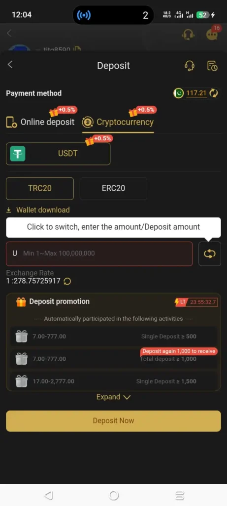 USDT (Tether) is PK555Bet’s primary and most recommended deposit method. Available across three networks TRC20, ERC20, and BEP20 USDT deposits are confirmed almost instantly (usually within one to three minutes) with zero platform fees. USDT’s dollar-pegged stability makes it the ideal currency for a betting platform: players know exactly what their balance is worth in real-world terms without worrying about cryptocurrency price volatility affecting their funds.